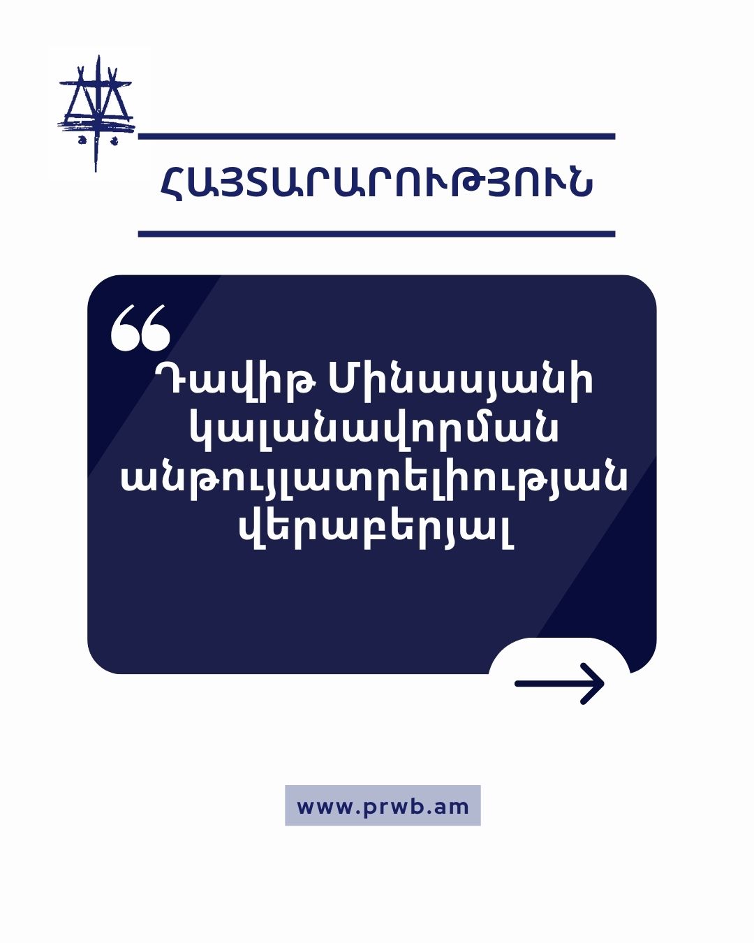 Դավիթ Մինասյանի կալանավորման անթույլատրելիության վերաբերյալ Մենք՝ ներքոստորագրյալ հասարակական կազմակերպություններս, խստորեն դատապարտում ենք և մեր մտահոգությունն ենք հայտնում Դավիթ Մինասյանի նկատմամբ կալանավորումը` որպես խափանման միջոց ընտրելու