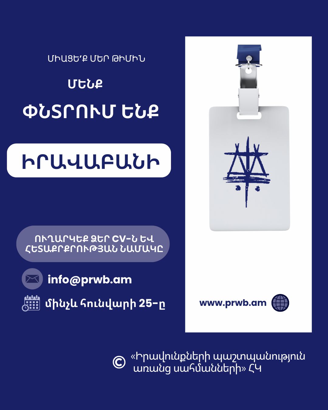 «Իրավունքների պաշտպանություն առանց սահմանների» ՀԿ-ն աշխատանքի է հրավիրում քաղաքացիական և վարչական իրավունքի մասնագիտացում ունեցող իրավախորհրդատվության տրամադրման և հետազոտություն իրականացնելու փորձ ունեցող իրավաբանի: