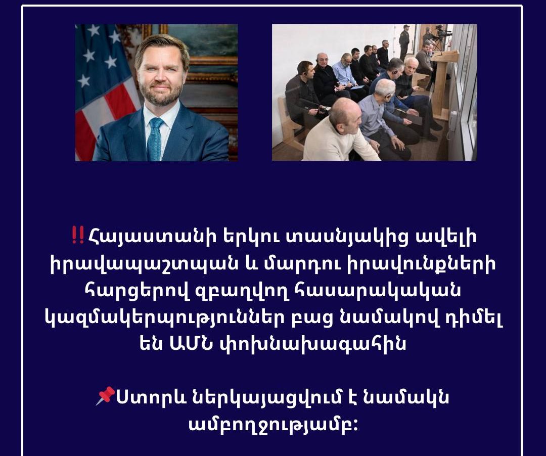ԱՄՆ փոխնախագահ Ջեյ Դի Վենսի՝ Հայաստան և Ադրբեջան կատարելիք այցի նախօրեին Հայաստանի երկու տասնյակից ավելի իրավապաշտպան և մարդու իրավունքների հարցերով զբաղվող հասարակական կազմակերպություններ բաց նամակով դիմել են ԱՄՆ փոխնախագահին՝ կոչ անելով աջակցել Բաքվում պահվող քրիստոնյա հայ գերիների ազատ արձակմանը: